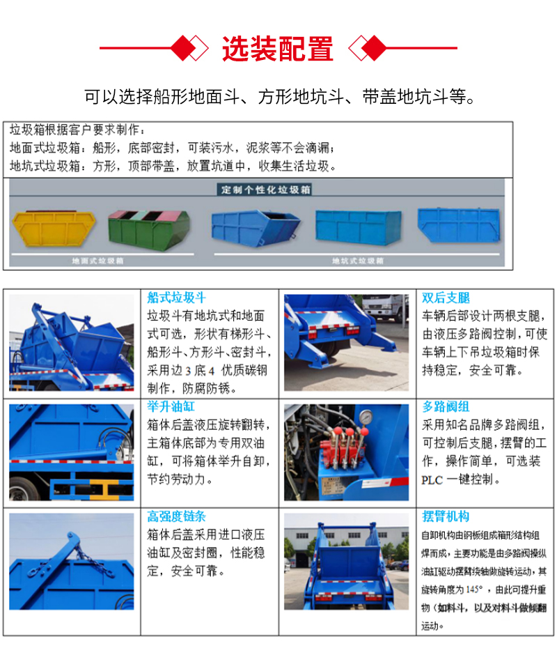 摆臂式垃圾车主要是左右两侧液压缸作用,链条承载垃圾箱重量,整车带自卸功能,安装液压支腿,确保安全稳定,垃圾箱可吊上吊下,该车的特点是垃圾箱与车体分开,能实现一车多箱循环周转,提高了车辆的运输能力,主要是环卫垃圾的收集、清理、运输等。垃圾箱有地坑地面两种,形状有长方形和梯形两种,也可加装密封盖,防止垃圾泄露飞扬二次污染。