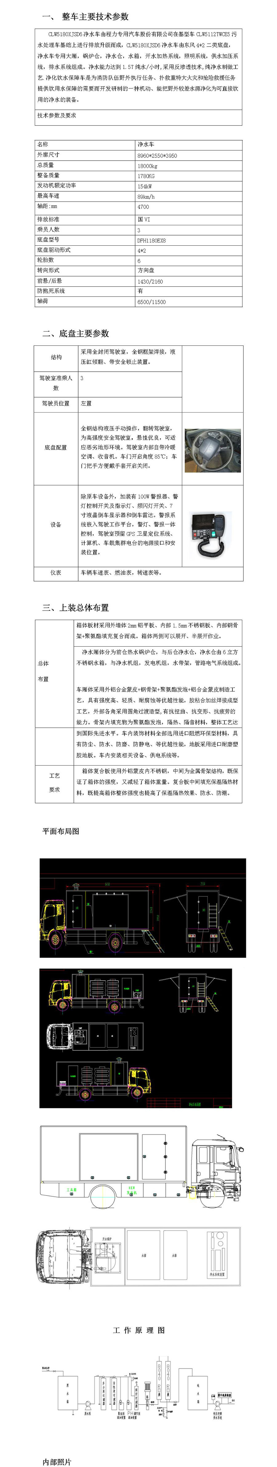 国内**款救灾水净化多功能车: 该车辆可保证水净化车设备迅速到达灾区现场,通过对灾区附近的污浊水源进行快速净化,为灾民提供源源不断的饮用水,并根据灾区需求,配置了发电、照明,加热、饮用水分装外运,是一个小型的抗灾救护、指挥协调**。