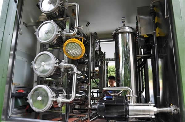 该车水净化系统采用全膜法去离子系统(全膜法除盐系统)。本系统以双级RO反渗透装置为脱盐工艺,MF微滤装置、UF超滤装置为预处理,保证反渗透系统的正常运行。UV紫外线杀菌装置和终端MF微滤装置为产品水的杀菌和热原很终处理工艺,确保经过处理后的水质达到《**生活饮用水卫生GB56749-2006》指标。本系统采用人机界面和PLC自动**,MF装置、UF装置、RO装置以及各种工艺泵均同PLC自动操作。