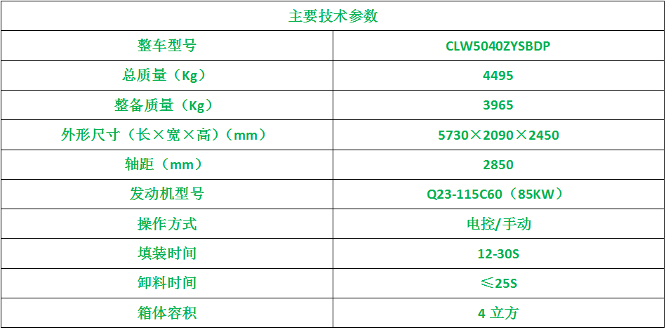 上装配置:箱体厚度采用边4个厚、底4个厚的优质碳钢板生产,全箱体满焊,箱体为联体式,外接电源工作,翻转进料,带压缩推板,后部带锁紧门,带污水收集箱,带室内操作系统,也可以室外双操作,做到驾驶室内和尾部外都可以操作,非常实用,尾部带密封橡胶垫,可防污水滴漏二次污染。