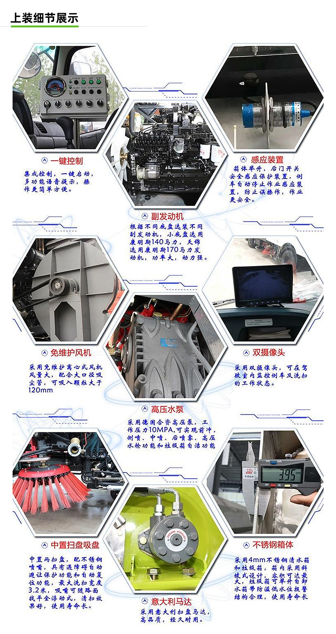 3:在一键控制技术基础上增加副发动机手动油门控制系统,可根据路况独立调节油门大小,有效增强洗扫效果,减少油耗。